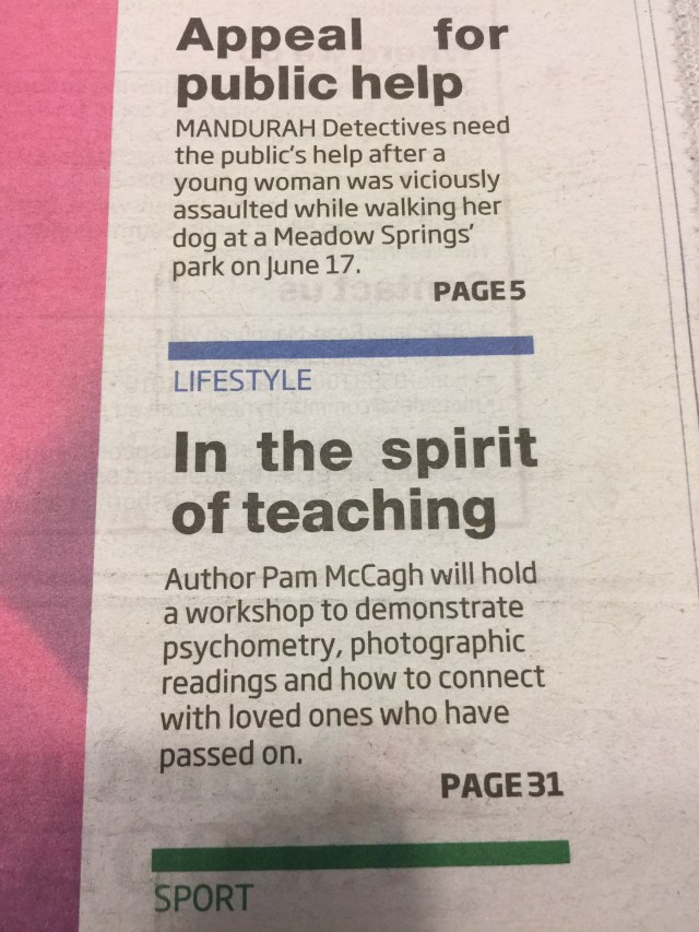 TLA is in Mandurah on special assignment. Perhaps he’ll bump into “international clairvoyant” Pam McCagh and have a psychometric test. This gruesome item is from the Community Newspaper Group. I dare you to click the link to see the pink lampshade. “PAM McCagh can be in a shopping centre, the shower or lying in bed when an unusual feeling comes over her and the urge comes.” The ridiculous in the risible.