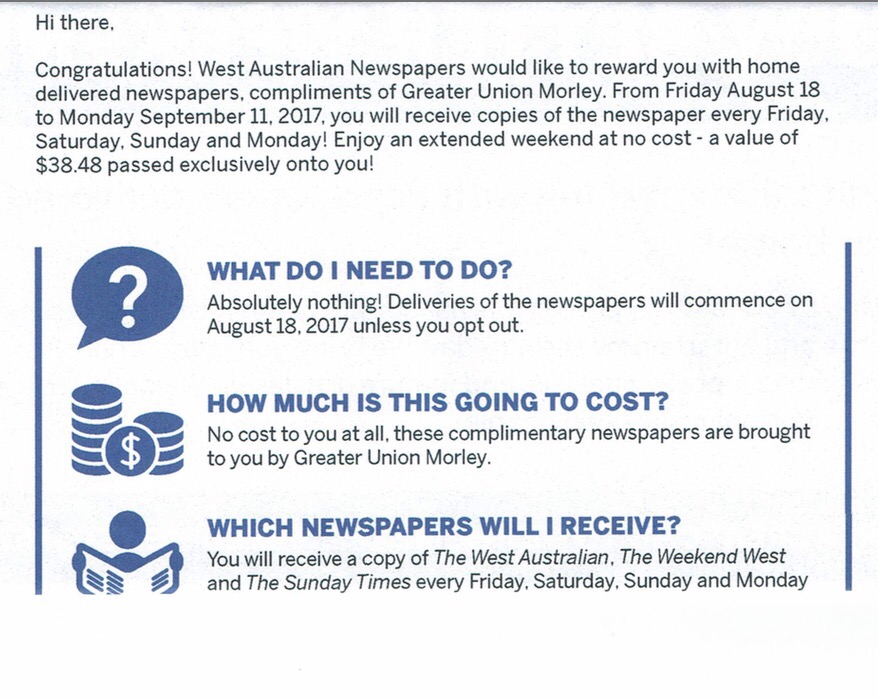 Exactly. Don’t worry, the whole correspondence promises that they will be trying to get me to subscribe after the free trial. They have also promised me that their newspapers will allow me to “enjoy better weekends”. I wonder if this is legally enforcable?