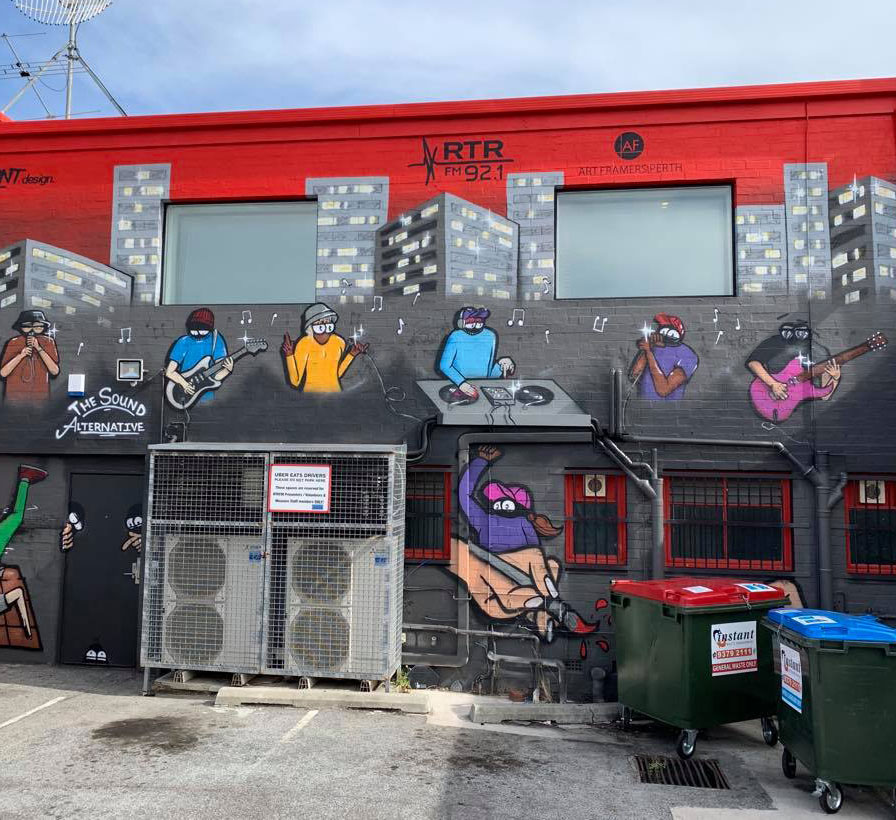 There can be no better example of how street art in Perth has been erased by anodyne civic decoration than the rear of RTR FM’s building in Beaufort Street Mt Lawley – to the extent that almost nobody realises that there is even a difference in concept between say adding brick paving and painting a wall mural. In Perth these are exactly the same things in both intent and effect. Do you spend money on a planter box or a wall mural? In Perth these are interchangeable, or to use a word that has suddenly emerged out of obscurity and into the arts scene fungible.